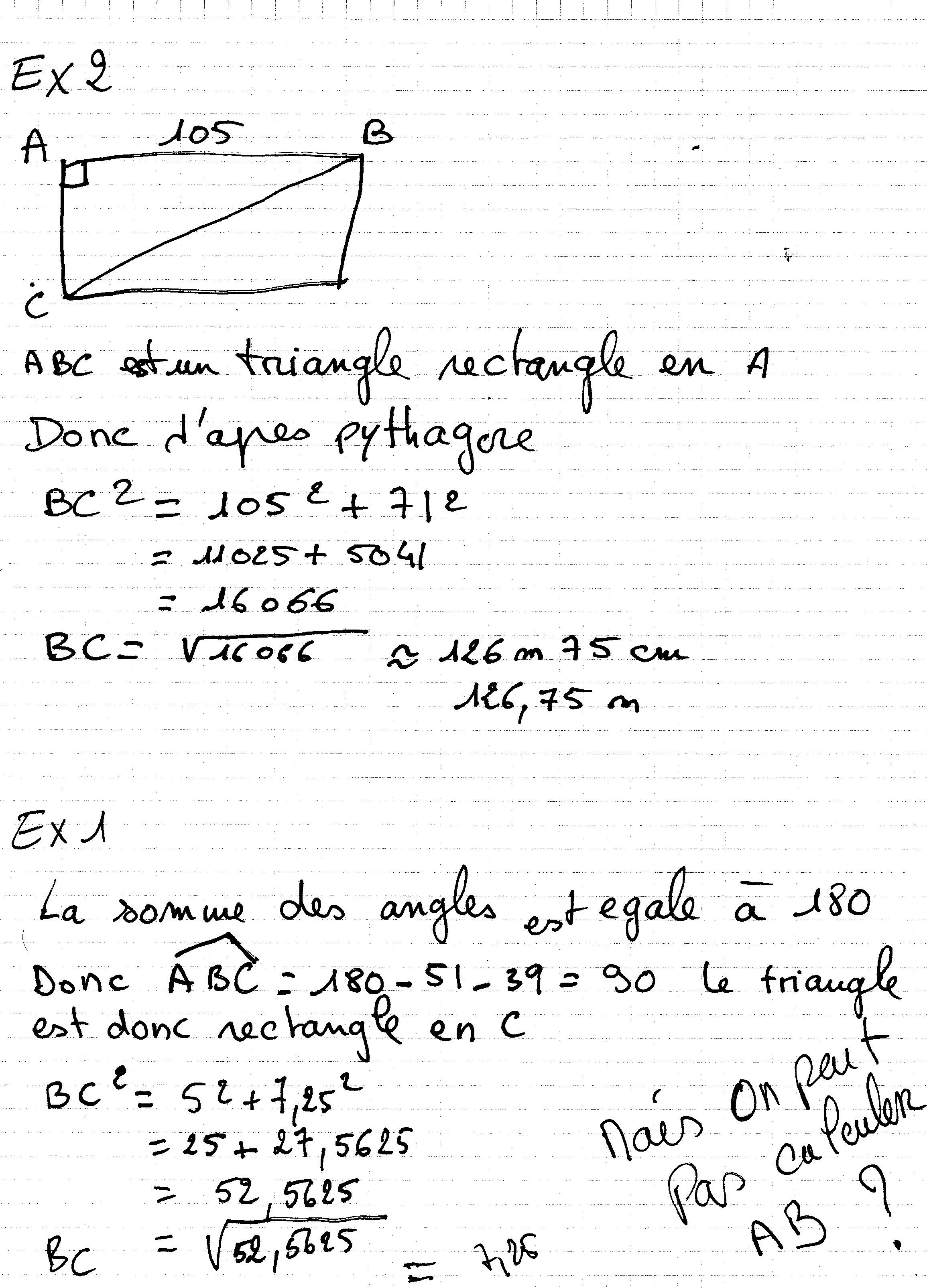 Par contre, pour l'exercice 1, tu dis que le triangle est rectangle en C (ce qui est juste et tu l'as bien démontré) mais ensuite tu appliques le théorème de Pythagore comme si le triangle était rectangle en A, ce qui évidemment est faux : reprends cette partie de ton exercice.