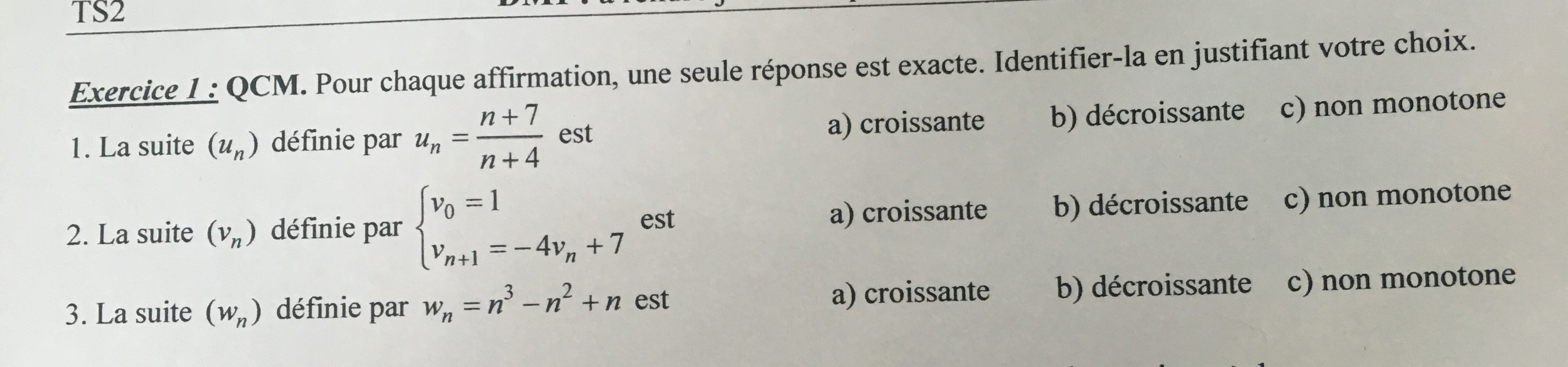 bonjour, v1 = 3, v2= 0, v3 = 7 donc la suite est croissante et décroissante soit monotone ?