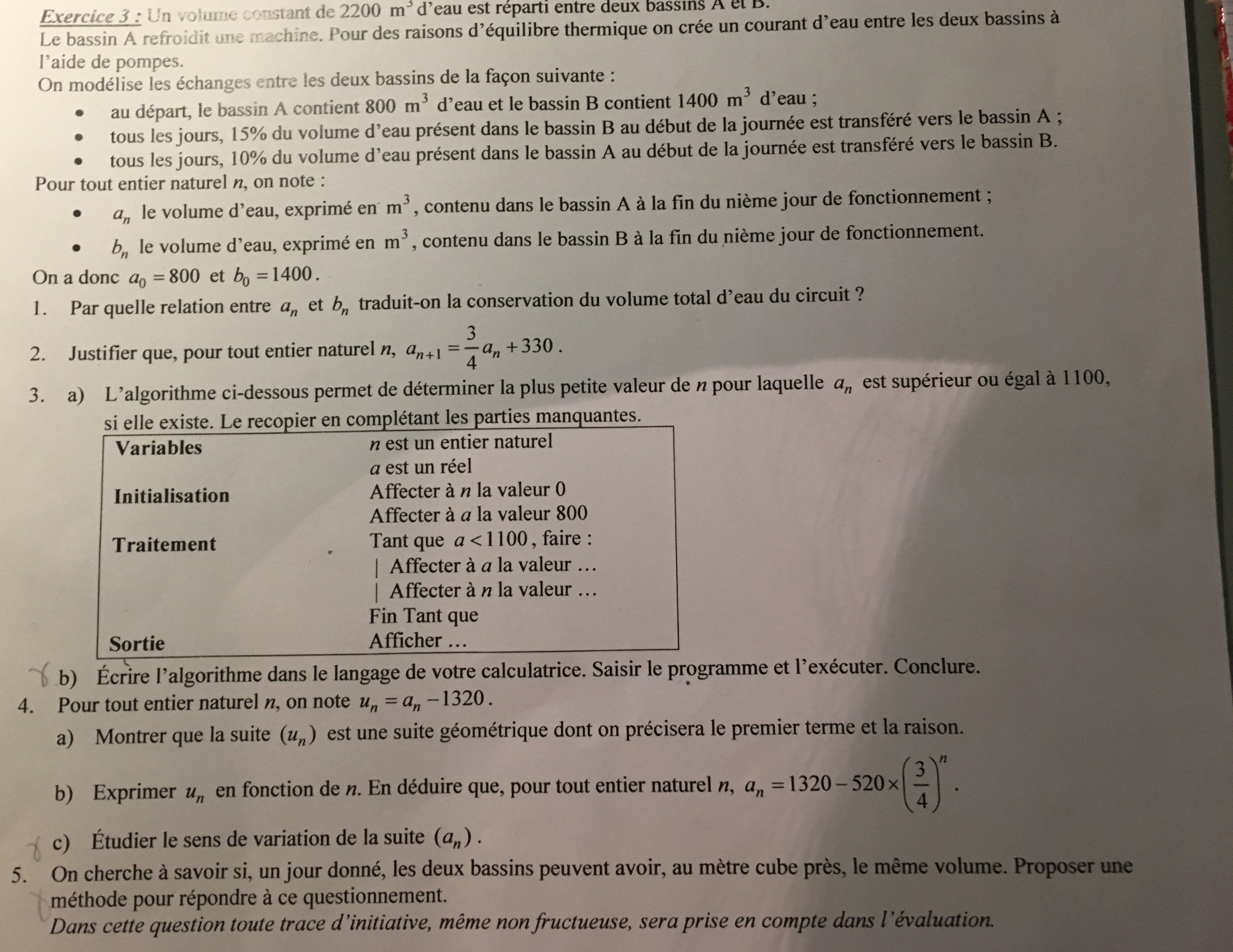 Pour la 5) les deux volumes d'eau seront égaux si a\(_{n}\) = b\(_{n}\).