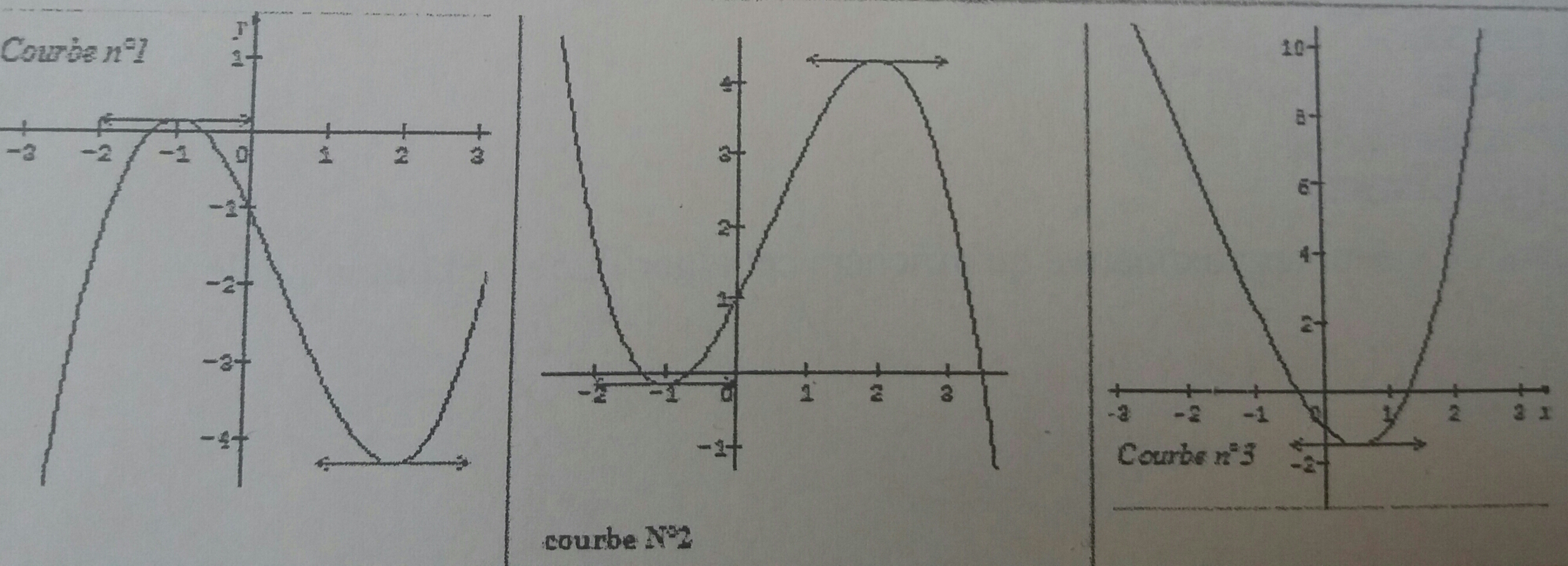 Alors F '( - 1) = F '(2) = 0 donc les coefficients directeurs de la tangente en - 1 et 2 donc les tangentes sont parallèles aux axes en - 1 et 2. Es tu d'accord sur premier point. Quelle courbe vas-tu alors éliminer ?