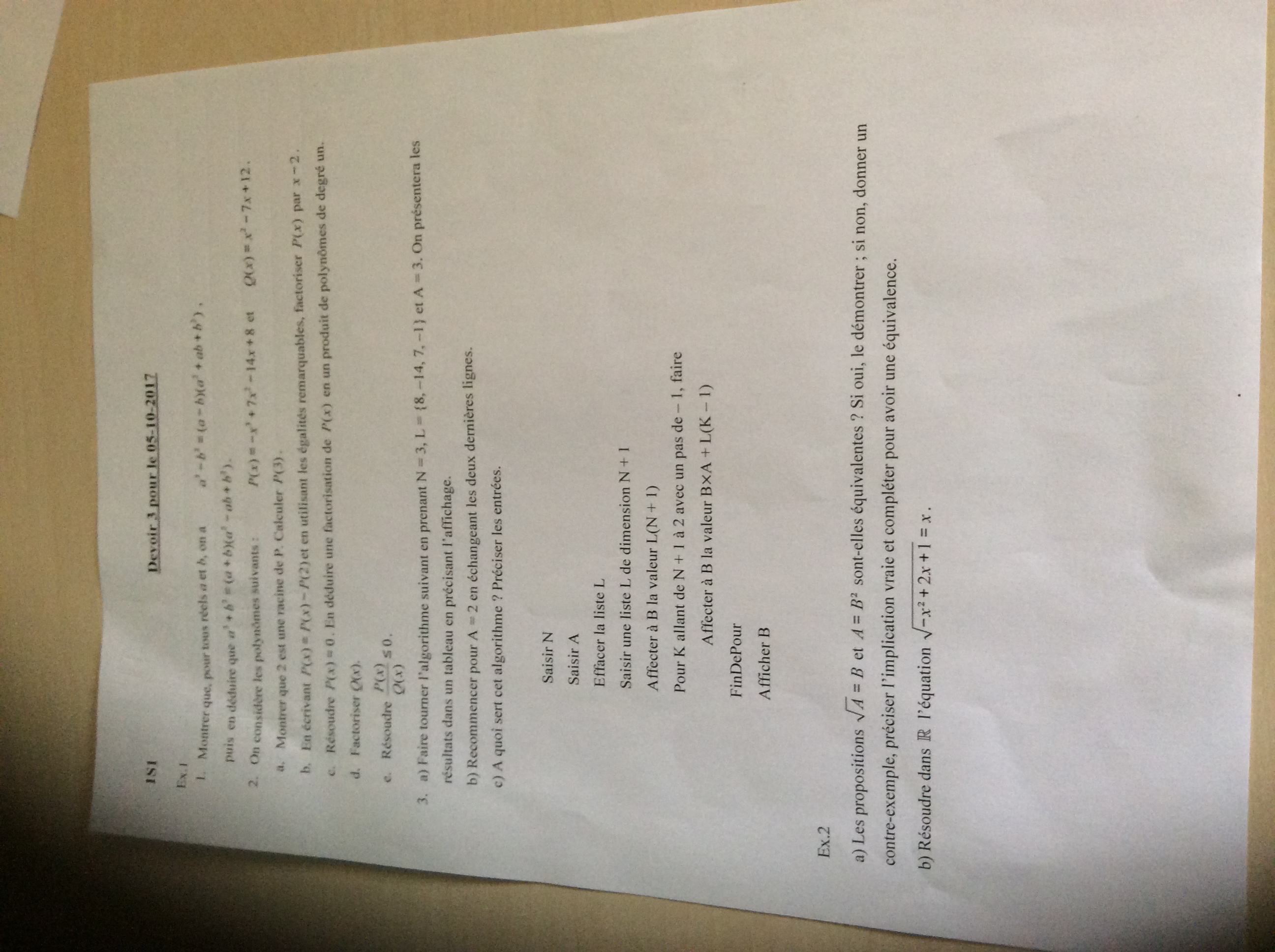 J'ai résolu tout le 1 et 2 de l'exercice 1 mais pour le 3 je n'ai jamais vu d'algorithme donc je ne sais pas ce qu'il faut faire