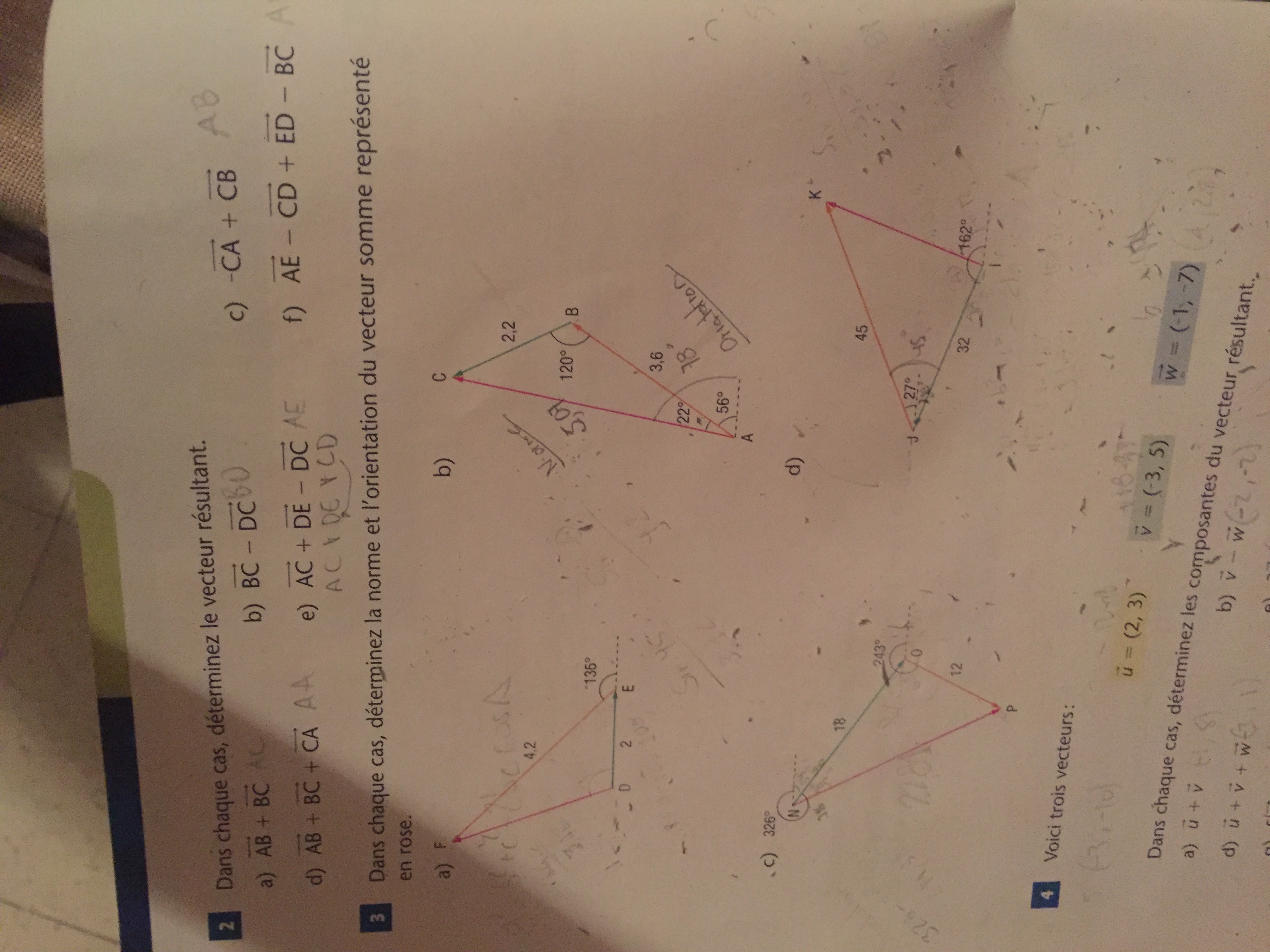 Le d) aussi je rencontre des difficultés voici ce que j’ai pu faire 180-162=18 degré puisque mes angles sont alternes-externes l’angle en bas de 27 est 18 et si on additionne on obtient le vrai angle qui est 45 degré et on peut faire le calcul pour trouver la norme mais comment trouver la norme?