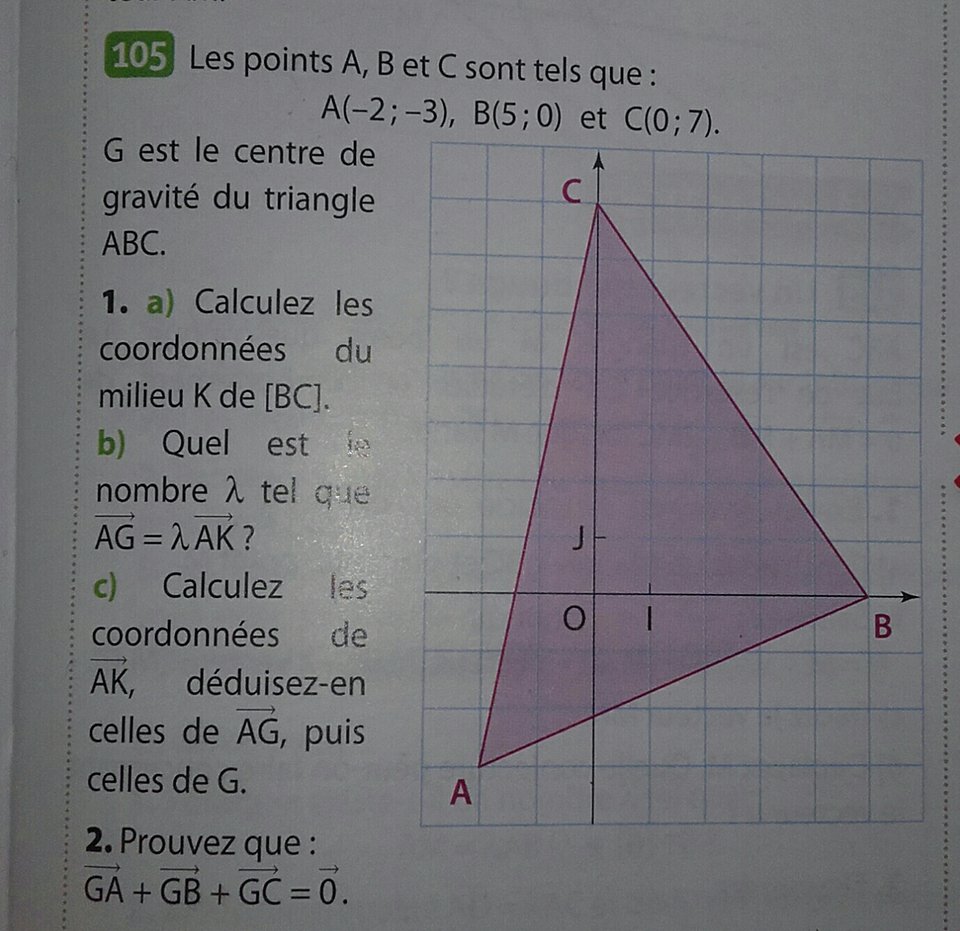 Question 1c : il faut utiliser une formule (voir ton cours ou ton livre) pour calculer les coordonnées du vecteur \(\vec{AK}\). Pour celles de \(\vec{AG}\) c'est une autre formule.