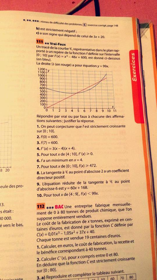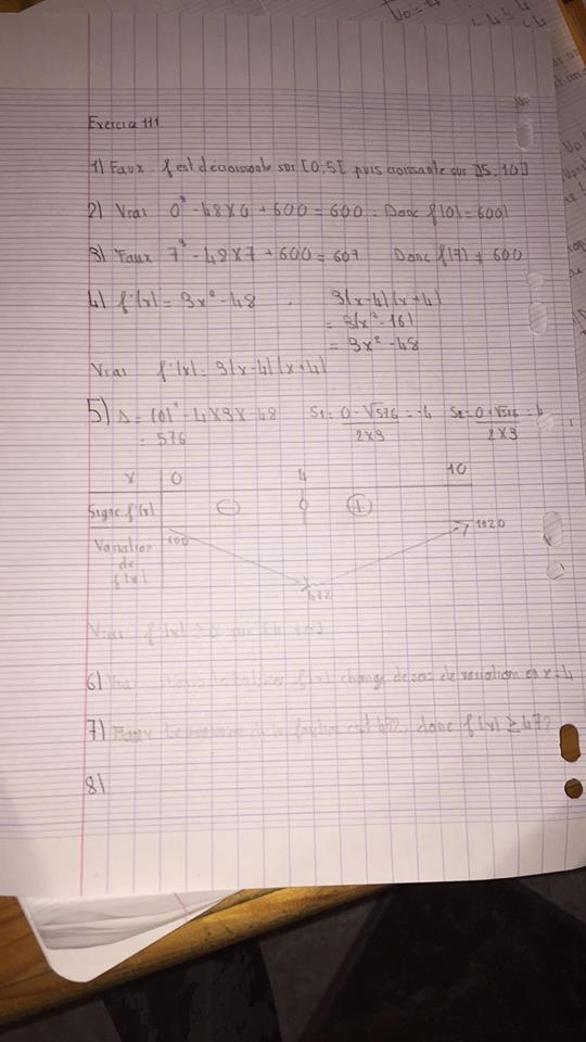 Il semblerait que la réponse soit VRAI au 7) vu le minimum de f sur [0;10] égal à 472 que tu as trouvé.