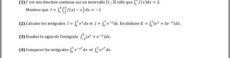 Les deux dernières questions concernent plutôt le signe d'une intégrale. Donc il faudra utiliser le fait que si une fonction (intégrable) est positive sur [a;b], alors l'intégrale de f entre a et b sera positive.