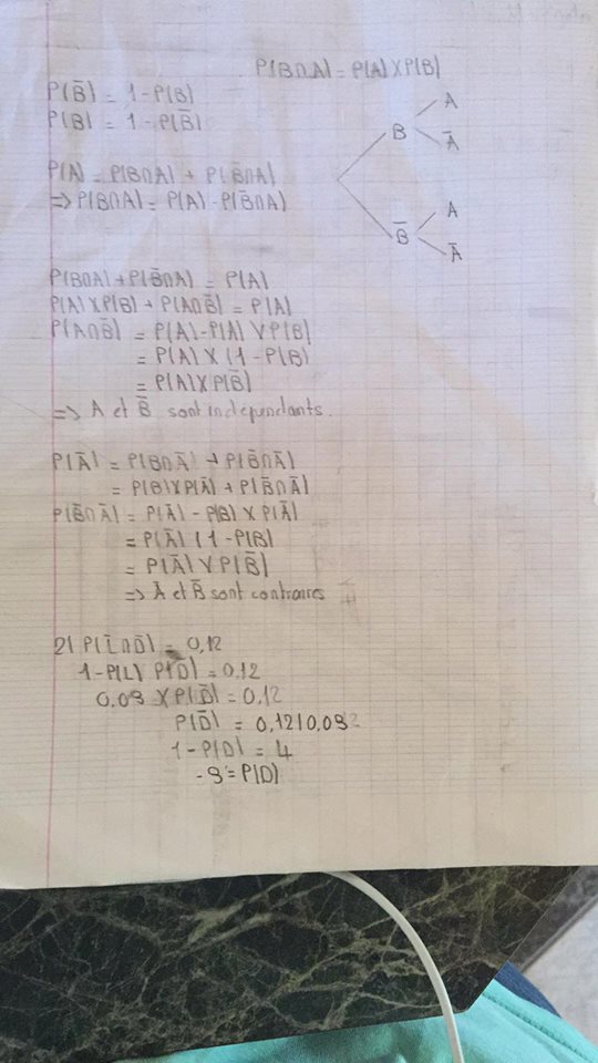 P(\(\overline{D}) - 0,03 P(\overline{D})= (1 - 0,03) P(\overline{D})= 0,97 P(\overline{D})\) donc égale à 0,09