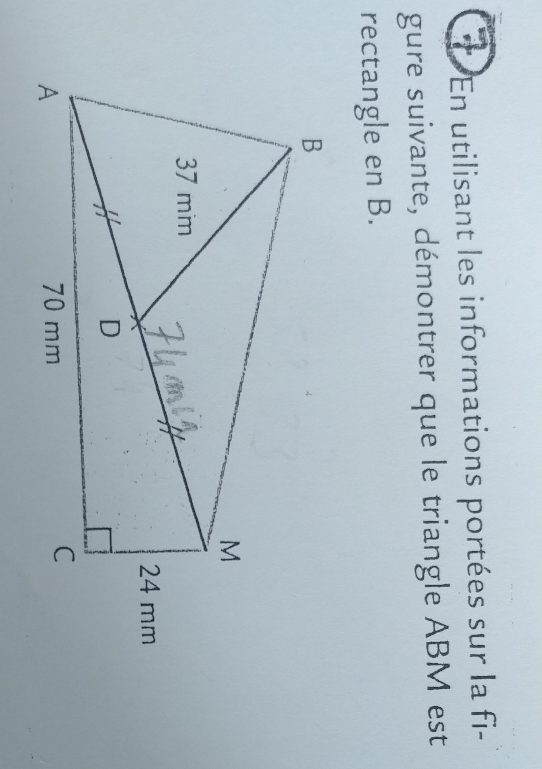 Ensuite tu constates que le milieu de [AM] est à égale distance de A, M, B et tu dois avoir une propriété dans ta leçon qui permet de justifier ainsi que le triangle ABM est rectangle.