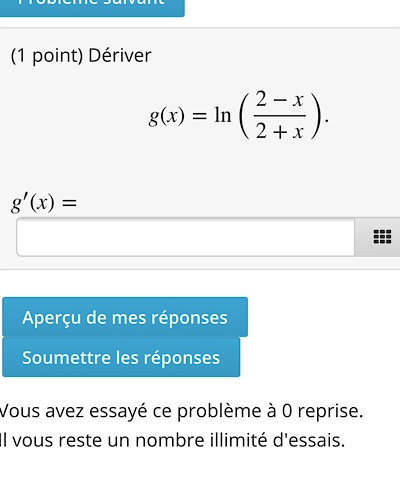 Pour la fonction \(g\) il faut utiliser la formule \((ln(u))'=\dfrac{u'}{u}\) en posant \(u(x)=\dfrac{2-x}{2+x}\).