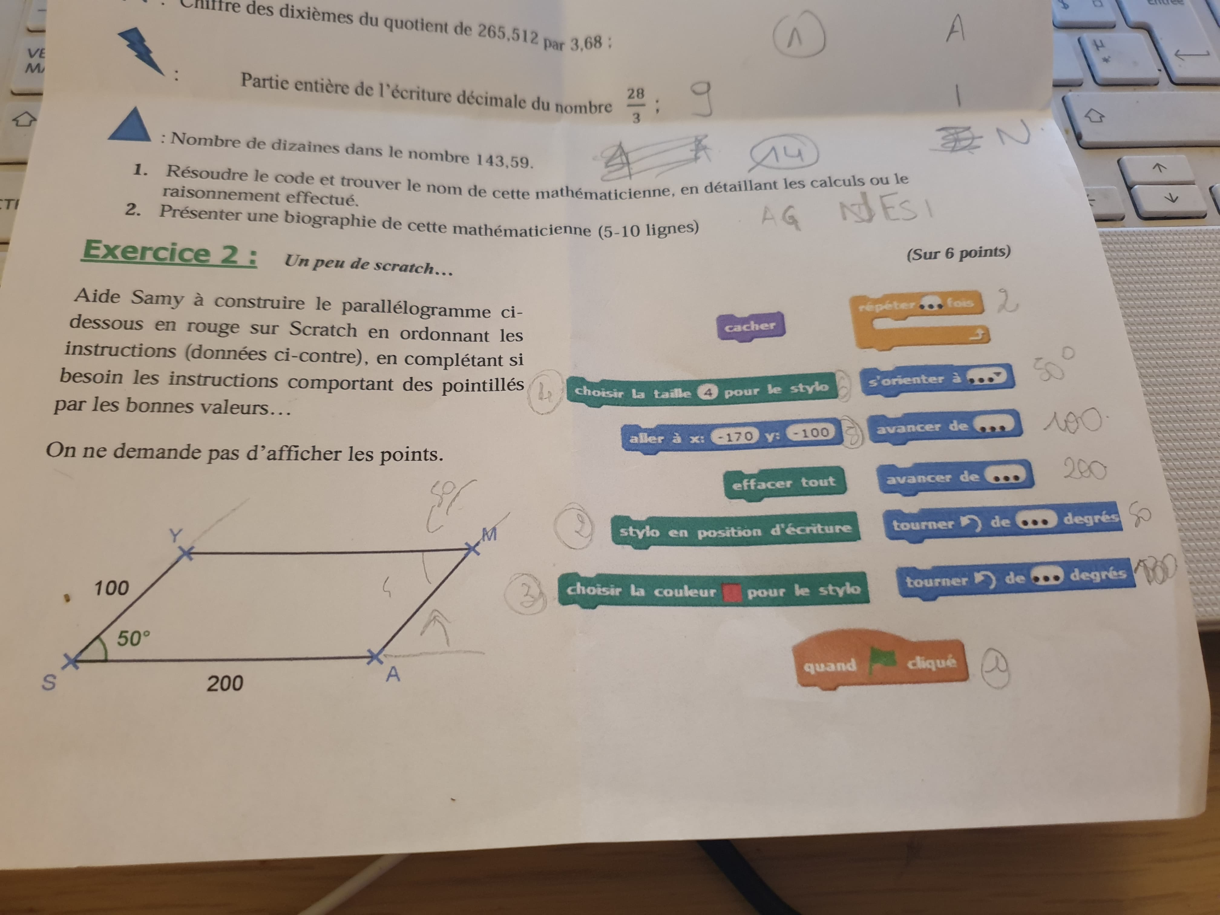 Aide samy a construire le parallélogramme ci dessous en rouge en ordonnant les instructions ci dessous en complétant si besoin les instructions comportant les pointilles par les bonne valeurs