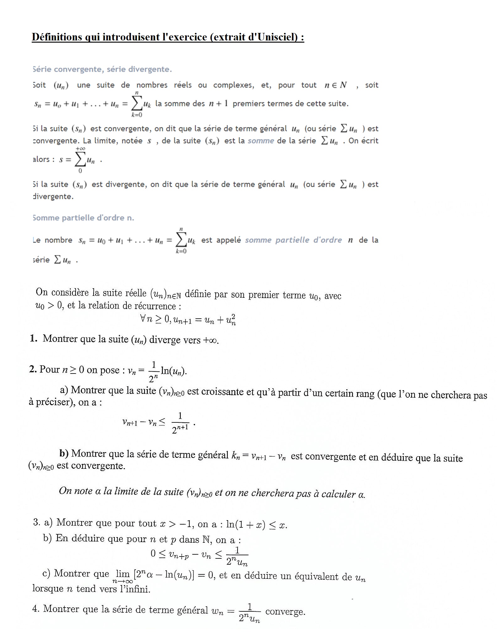 J'ai aujourd'hui un autre exercice à faire : mon professeur m'a dit que c'était un mix de sommes et de suites, des séries. Il m'a dit que c'était globalement faisable avec le programme de TS, ainsi qu'avec la définition d'introduction dans l'exercice. Il m'a aussi dit que je pouvais m'aider des propriétés que je comprenais listées ici : http://math.univ-lyon1.fr/~oger/enseign ... 3%A9mo.pdf. Apparemment il a dit qu'il faudrait probablement utiliser la comparaison des séries positives et les séries géométriques, un peu comme les suites géométriques de Première il m'a dit...