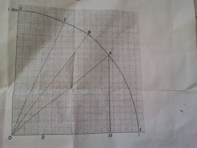 On considère le quart de cercle de centre O et de rayon OI=OJ=1dm.