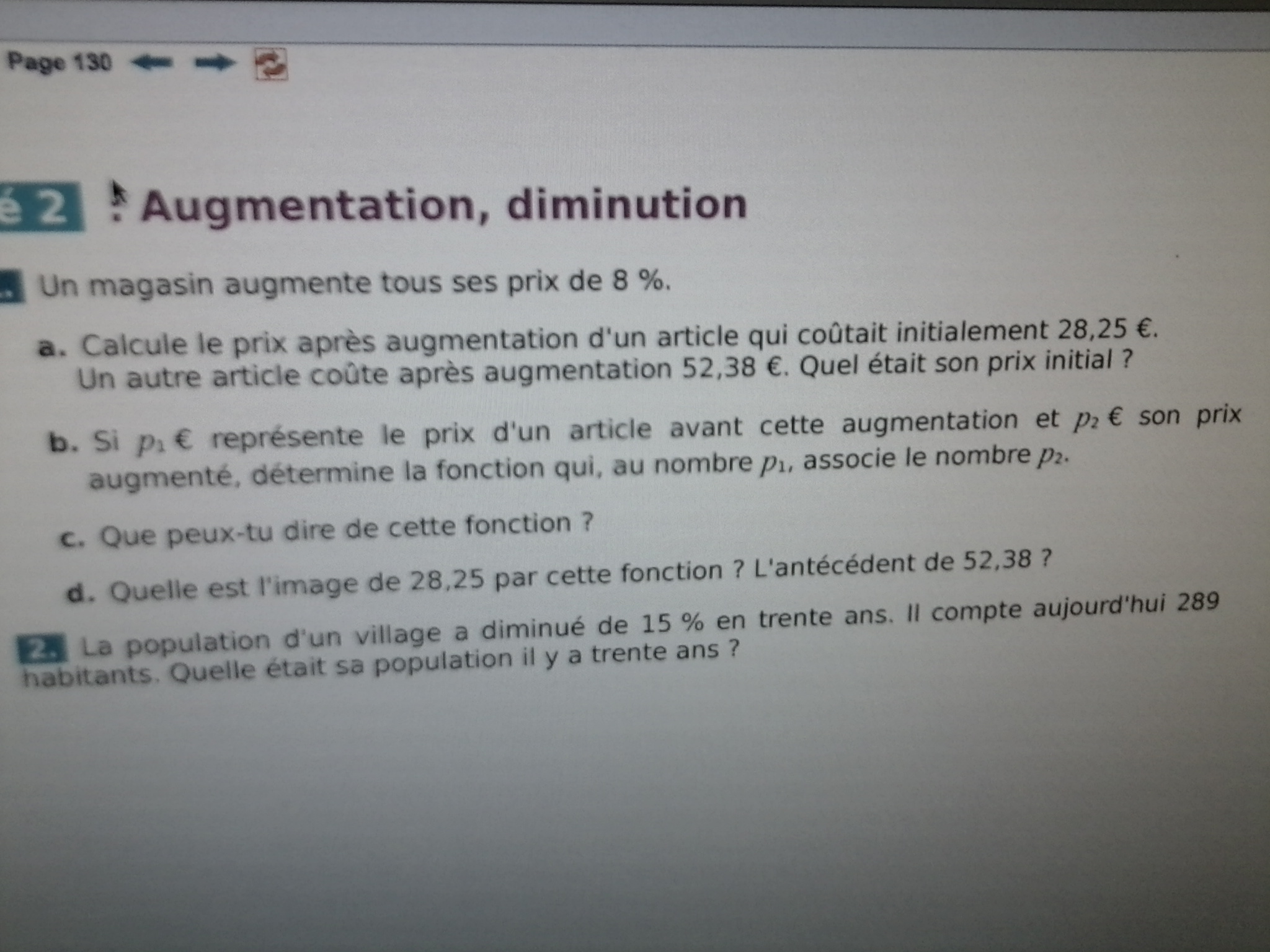 Pars d'un prix \(p_1\) que tu augmentes de \(8\%\) pour obtenir le prix \(p_2\).