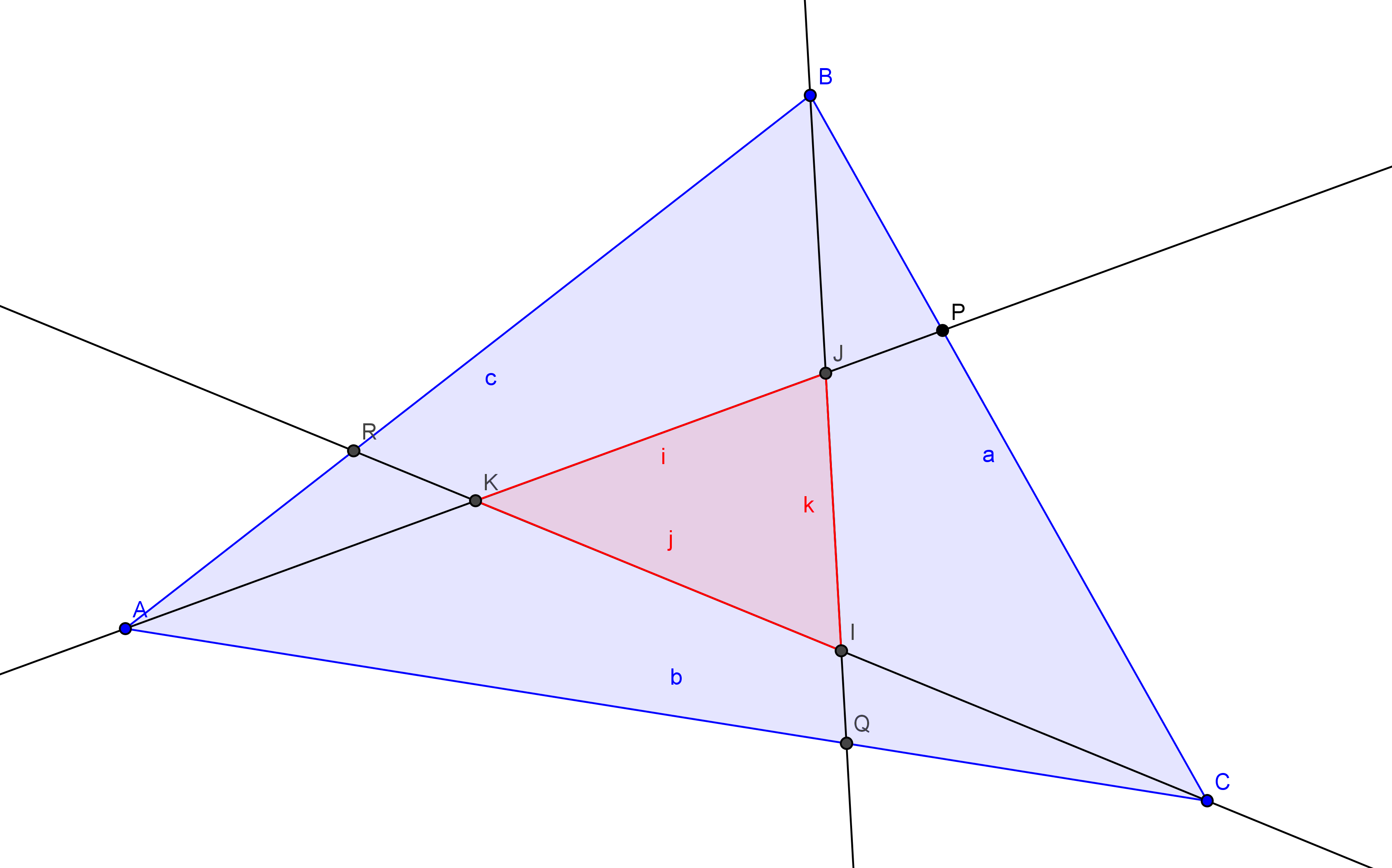 Donc si tu fais la somme de ces trois aires, tu obtiens l'aire de ABC, mais il y a des chevauchements et un trou : BJP, ARK et IQC sont comptés deux fois alors que IJK n'est pas compté donc cela signifie que IJK est la somme des aires de ces trois triangles.