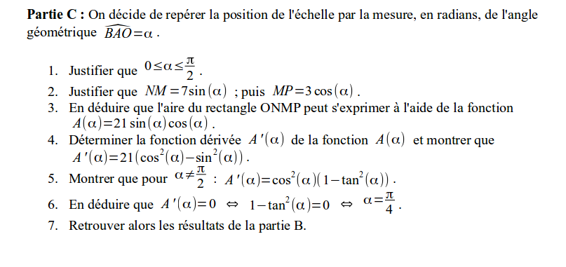 Une échelle AB de longueur 10m est posée contre un mur. Le point M de [AB] est tel que AM=7. On fabrique le rectangle ONMP. On cherche quelle est la position de l'échelle permettant d'obtenir le rectangle d'aire maximale.