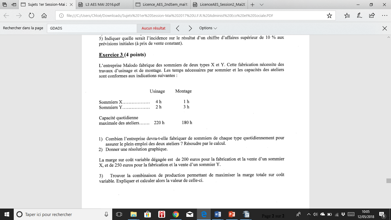 Pour le matelas X, il faut 4h d'usinnage et on a seulement 220 h dispopnibles ... donc on pourra faire 220/4 = ... matelas.