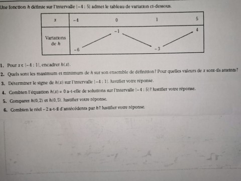 pour la première question, si tu regardes l'intervalle \([-4\,;\,1]\) sur la ligne des \(x\), tu vois que sur cette portion, ta fonction a deux sens de variation : croissante sur \([-4\,;\,0]\) et décroissante sur \([0\,;\,1]\). Il te reste à regarder les valeurs des images sur ces intervalles : \([-4\,;\,0]\), \(h(x)\) varie entre -5 et -1 et sur \([0\,;\,1]\), \(h(x)\) varie entre -3 et -1.