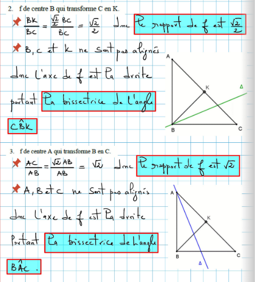 Donc une fois que l'on a établi que le rapport de similitude était différent de 1, on sait que la similitude est la composée d'une homothétie de centre B et d'une réflexion d'axe passant par B : c'est donc la bissectrice de \(\widehat{ABK}\).
