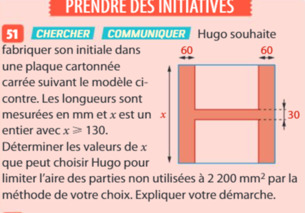enoncé: Hugo souhaite fabriquer son initiale dans une plaque cartonné carré. Les longueurs sont mesurées en mm et x est un entier avec x supérieur ou égal a 130.