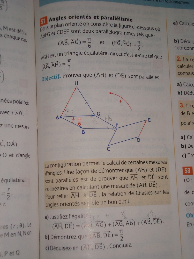 b)(AB;DE)=π/2 j'ai utilisé la relations de Chasle avec les mesures que l'on me donne mais je n'avance pas : (AB;DE)=(AB;FG)+(FG;FC)+(FC;DE) je sais que (FG;FE)=π/2. c'est pour sa que j'ai penser à faire cela mais sa ne m'avance pas beaucoup car je ne connait pas les deux autres angles orientés.