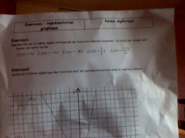 Si c'est le 1, tu sais d'après le cours par quoi est représentée une fonction linéaire. Et tu connais un point par lequel passe cette représentation. Il reste à bien comprendre le rôle du "coefficient directeur". C'est certainement indiqué dans ton cours, et c'est ce qui t'évitera de donner une valeur particulière à x. Reviens sur le forum si tu ne comprends pas les indications de ton cours.